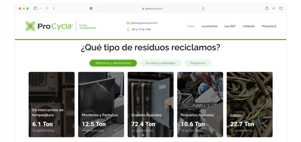 Landing page corporativa y transaccional para una planta de valorización de residuos industriales y electrónicos (RAEE), enfocada en el cumplimiento de la Ley REP.