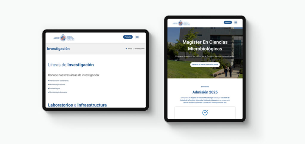 Diseñamos una estructura clara que destaca las áreas de investigación (como Microbiología Aplicada y Ambiental), integramos un portal de postulación directo y secciones dinámicas de noticias y seminarios para mantener a la comunidad actualizada.
